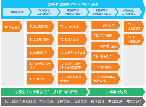 金蝶的财务共享高蓝顾问团队,遵循项目管理理论,借鉴金蝶大量财务共享的优秀实施项目经验,在十多年的实践经验基础上,创造性地提出了金蝶财务共享高级业务蓝图实施体系,用于规范和指导顾问的日常实施工作,确保项目的正常实施,从而“帮助顾客成功”。在项目的具体实施过程中,金蝶公司将充分尊重客户的个性化需求,通过标准化服务与个性化服务相结合,为客户提供快速、有效的实施服务。